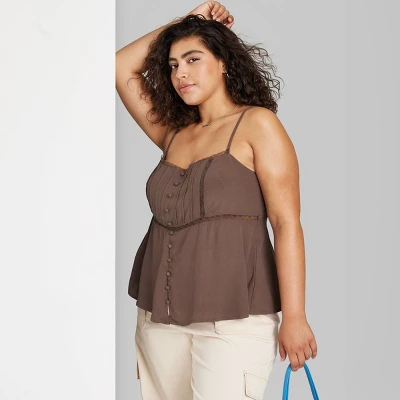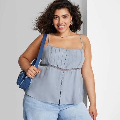Spaghetti strap cami with lace trim from Wild Fable™. Features adjustable shoulder straps with tie detail in back. Front designed with pleats, buttons and lace trim on neckline and below bust. Lightweight fabric with a relaxed fit and flattering drape. Hem hits below waist.